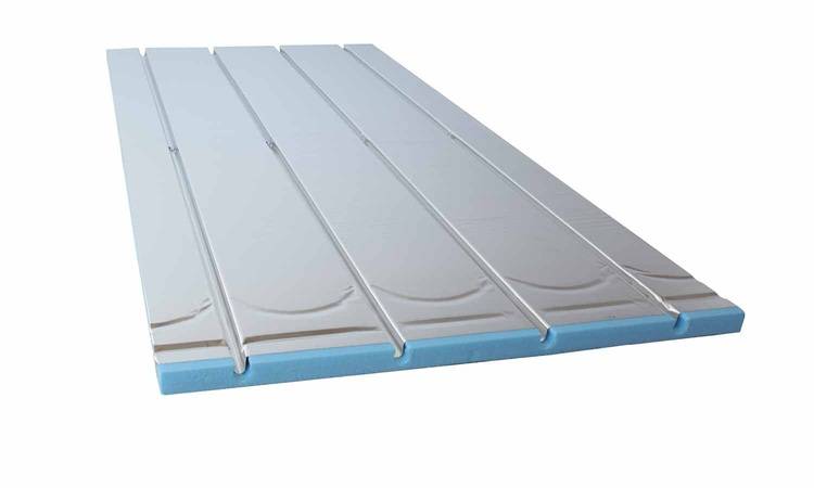 Das Fußbodenheizsystem von Zewotherm besteht aus einer aluminiumbeschichteten XPS 400-Platte (extrudiertes Polystyrol). In deren vorgestanzte Rillen wird mit einem Verlegeabstand von 15 cm ein 16-er Heizrohr eingedrückt. Die geringe Aufbauhöhe von 25 mm (ohne Bodenbelag) macht das System insbesondere für Sanierungsvorhaben interessant.