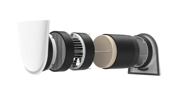 Zudem wartet das Gerät, genauso wie die Lüftungsgeräte Duplex Vent 800, S 1000 und 1200, mit einem neuen Fassadengitter auf. Dieses schützt vor Wettereinflüssen, indem es zuverlässig das Eindringen von Regen oder Schnee in die Lüftungskanäle verhindert. Dabei wird in der Fassade lediglich ein Lochdurchmesser von 315mm benötigt, was Installationskosten niedrig hält. Die aerodynamische Form der Lamellen sorgt für deutlich geringere Turbulenzen auf der Rückseite des Gitters, wodurch Druckverlust, Energieverbrauch und Eigengeräusche reduziert werden.