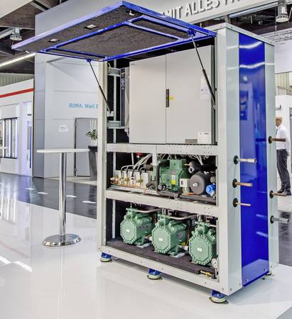 Für Kälteleistungen bis 40 kW ist der CO2-Mini-Booster carbo-Line vorgesehen, der demnächst auch schnell und einfach online selbst konfigurierbar sein soll. Das gilt bereits jetzt für c-greyline, die Standardbaureihe des Herstellers für kleine und mittlere Kälteleistungen von 1 bis 120 kW im Baukastensystem. Ammoniak-Kältemaschinen cab mit offenen Schraubenverdichtern gibt es als Einzelverdichter oder Parallelverbund für Kälteleistungen bis 1 500 kW. Die Propan-Kältemaschine combiChiller in zwei verschiedenen Größen ist mit Hydromodul und Schaltschrank ausgestattet. Alle Anlagen lassen sich einfach installieren und warten.