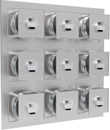 Bei parallel betriebenen EC-Ventilatoren ECFanGrid von Rosenberg vervielfacht sich der Volumenstrom proportional der Ventilatorenanzahl, bei gleichbleibenden Druckverhältnissen. Die eingesetzten EC-Ventilatoren ermöglichen als abgestimmte Einheit (Elektronik, Motor & Laufrad) einfache Plug & Play-Lösungen für nahezu alle lüftungstechnischen Anforderungen. Im Vergleich zu einem großen Radialventilator werden bis zu 50% Einbaulänge eingespart. Ebenso ist die Verteilung der Luftgeschwindigkeiten gleichmäßiger, Ausgleichstrecken können verkürzt und nachfolgende Komponenten effizienter angeströmt werden.