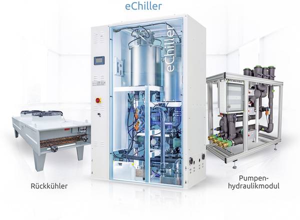 Mit dem Kältemittel Wasser (R 718) arbeiten die energieeffizienten Kaltwassersätze eChiller von Efficient Energy. Sie eignen sich zur Kühlung von Serverräumen, industriellen Prozessen sowie Gebäuden, sind im Leistungsbereich von 20 bis 45 kW Kälteleistung zu haben und modular skalierbar auf über 300 kW. Die integrierte stufenlose Regelung schaltet bei Kühlwassertemperaturen, die nur geringfügig unterhalb der geforderten Kaltwassertemperatur liegen, in den Freikühlmodus. Je nach Anwendungsfall werden so über ein Jahr betrachtet bis zu 80% Energieersparnis erzielt.