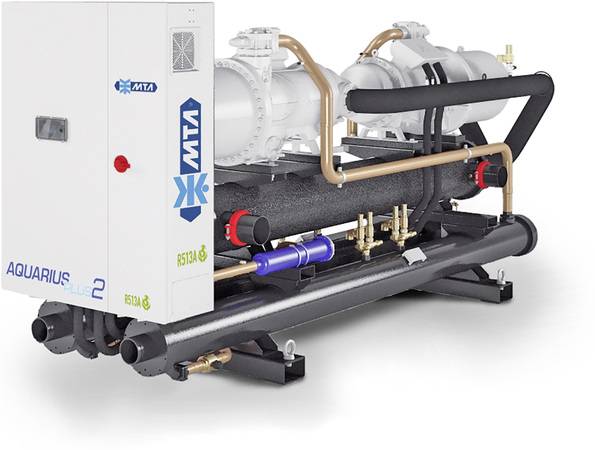 Die wassergekühlten Kältemaschinen Aquarius Plus von MTA für den Betrieb mit dem Kältemittel R513A sind mit halbhermetischen Schraubenverdichtern ausgestattet. Sie erreichen nominelle Kälteleistungen von 377 bis 1 931 kW und liegen auch als Wärmepumpen und Verdichter-Verdampfer-Einheiten vor. Die Kaltwassersätze für große Prozesskühlungen und Klimaanwendungen haben eine stufenlose Leistungsregelung der Verdichter bis 25%, elektronische Expansionsventile und Wärmeübertrager mit integrierter Wärmerückgewinnung und geringen wasserseitigen Druckverlusten. Damit werden im Voll- und Teillastbereich hohe saisonale Wirkungsgrade erzielt.