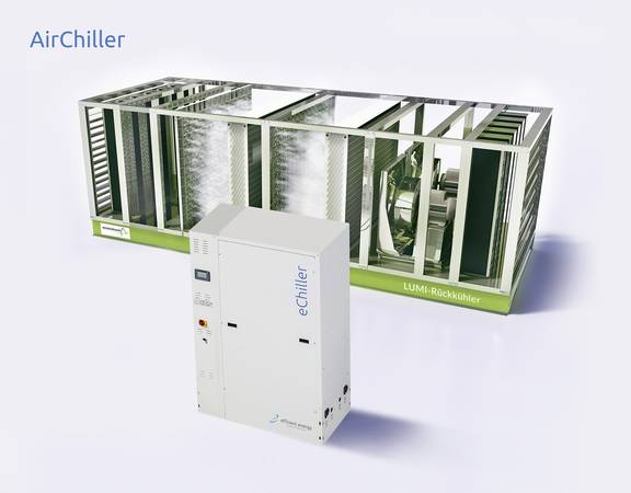 Der AirChiller ist eine luftgekühlte Kältemaschine für die Außenaufstellung mit einer Kälteleistung von 70kW. Er vereint die Vorteile des glykol- und chemiefreien Lumi-Rückkühlers von Michelbach sowie der eChiller-Modellreihe von Efficient Energy, die mit dem Sicherheitskältemittel Wasser (R718) betrieben wird. Der Rückkühler arbeitet mit Frischwasser sowie Hochdruckbefeuchtung und liegt mit oder ohne Adiabatik vor. Das System ist hygienezertifiziert nach VDI 2047, Blatt 2. Beide Komponenten sind hydraulisch und regelungstechnisch verschaltet.