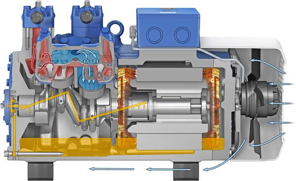 Die Motorkühlung erfolgt über eine kompakte Belüftungseinheit, die durch gezielte Luftkühlung nicht nur den Motor selbst, sondern auch die Zylinderköpfe kühlt. Dadurch kann die Druckgastemperatur reduziert werden. Daraus resultieren eine deutliche Leistungserhöhung und eine Erweiterung des Einsatzbereichs. Die luftgekühlte HA-Baureihe bewirkt eine niedrigere Verdichtungsendtemperatur, was besonders vorteilhaft im Betrieb mit neuen Niedrig-GWP-Übergangs-R 404 A-Ersatzkältemitteln ist. Zudem erreicht die Baureihe eine höhere Effizienz, insbesondere im Vergleich zu Kompressor-Modellen mit Flüssigkeitseinspritzung für die Gaskühlung.