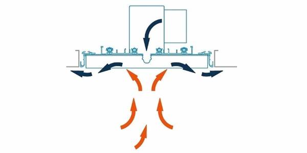 Die konditionierte Zuluft wird durch feine Düsen in den Raum eingebracht und dabei in zahlreiche Einzelstrahlen aufgeteilt. Aufgrund der hohen Induktion vermischt sie sich rasch mit der Raumluft und gewährleistet so eine bestmögliche Verteilung im Raum – selbst bei größeren Raumhöhen aufgrund der Medienwände. Diese Mischluft wird mit sehr geringen Geschwindigkeiten in die Aufenthaltszone eingebracht und vermeidet dadurch ein unangenehmes Zuggefühl – gemäß den geltenden Grenzwerten für "Zugfreiheit" wird dabei die höchste Komfortkategorie für bestmögliche Arbeitsplatzbedingungen eingehalten.