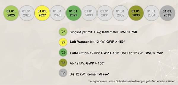 Bei Split-Wärmepumpen wird nach Luft/Wasser- und Luft/Luft-Anlagen unterschieden: Ab 12 kW Leistung müssen Luft/Wasser-Wärmepumpen ab dem 1. Januar 2027 und Luft/Luft-Wärmepumpen ab dem 1. Januar 2029 die GWP-Obergrenze von 150 einhalten. Für Luft/Luft-Wärmepumpen über 12 kW Leistung gilt ab dem 1. Januar 2029 eine GWP-Obergrenze von 750 und ab dem 1. Januar 2033 eine GWP-Obergrenze von 150. Ab dem 1. Januar 2035 dürfen in den EU-Markt Split(DX)-Wärmepumpen und Klimageräte mit F-Gasen nicht mehr in den Verkehr gebracht werden.