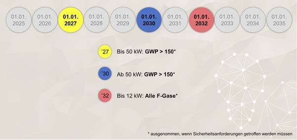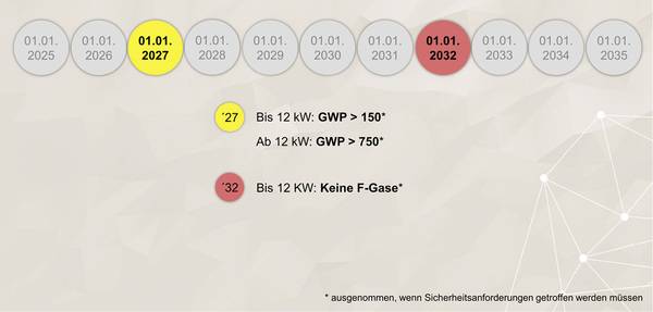 Ab 12 kW Leistung gilt ebenfalls ab dem 1. Januar 2027 eine GWP-Obergrenze von 750. Der nächste Schritt erfolgt mit dem 1. Januar 2032, ab dem keine F-Gase mehr in neu im Markt platzierten Chillern bis 12 kW Leistung eingesetzt werden dürfen.