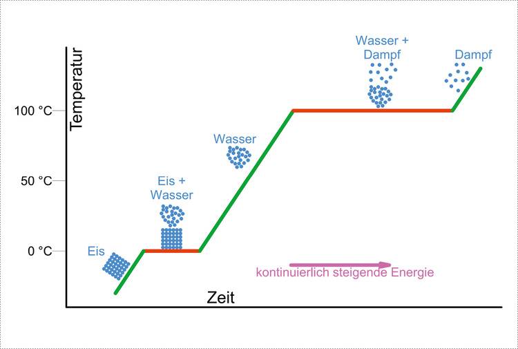 Um Wasser vom festen in den flüssigen oder dann vom flüssigen in den gasförmigen Zustand zu verwandeln, benötigt man jeweils eine große Menge Energie. Erst wenn diese Energiemenge zur Verwandlung geliefert wurde, lässt sich die Temperatur weiter erhöhen. Während zur Erwärmung von einem Kilogramm Wasser von 99 °C auf 100 °C die Energiemenge von rund 1,163 Wh notwendig wird, ist zur weiteren Steigerung um ein weiteres Grad die Energiemenge von 626,9 Wh notwendig, also erheblich mehr.