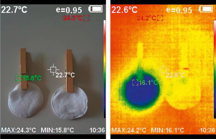 Im dargestellten Versuch zeigt das feuchte Pad laut Wärmebild eine Temperatur von 16,1 °C an. Das trockene Pad hingegen zeigt eine Temperatur von 22,6 °C an.