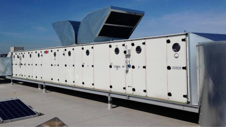 Anhand eines Gerätes der Kompaktklasse CRL von Wolf lässt sich dies gut veranschaulichen. Die Nennluftmenge beträgt dabei 13.500 m3/h. Die umgebende Fläche beläuft sich je Zug auf ca. 15 m2. Die Fläche zwischen Zu- und Abluftzug ist aufgrund ausgleichender Verhältnisse nicht berücksichtigt.