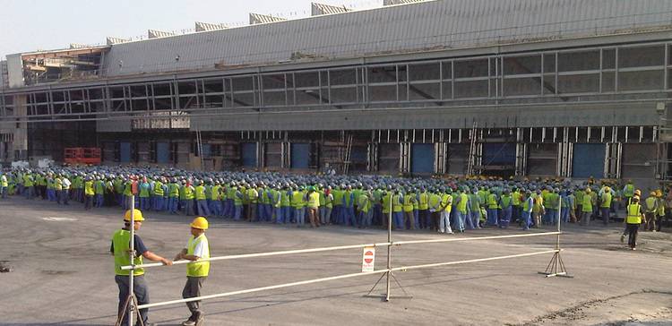 Ein regelmäßiger Anblick ist die Traube aus fünfzig grauen vor einem gelben Helm, der ihnen die nächsten Handgriffe erklärt. So muss täglich vor Arbeitsbeginn eine sogenannte „Starrt-Card“ ausgefüllt und beim Arbeitsschutz zur Unterschrift eingereicht werden. Der dazu gehörige Starrt-Talk soll alle Arbeiter auf die Besonderheiten und Gefahren ihrer unmittelbaren Arbeitsumgebung hinweisen. Es erinnert ein wenig daran, die Schuhe gebunden zu bekommen, bevor es raus zum Spielen geht. Angeblich ist das aber keine Übervorsicht, sondern Notwendigkeit, jedenfalls für die ungefähr zehntausend Hilfsarbeiter aus unter anderem Indien, Nepal und Zentralafrika. Die meisten von ihnen sind zum ersten Mal überhaupt auf einer Baustelle.