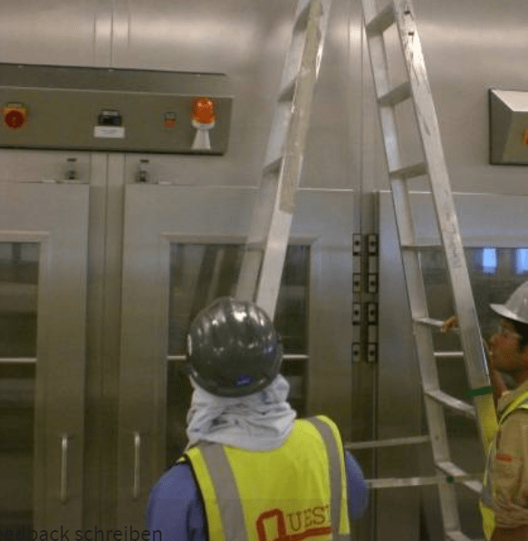 Ein Bäcker legt seine Brötchen nicht einzeln in den Ofen. Dafür hat er sogenannte Stikkenwagen. Diese sind grob 1,8 m hoch und kommen mit ihren 20 Blechen komplett in den Ofen. Tolle Sache. Dieses Konzept nutzen auch die sogenannten Cabinets. Das sind Ein- und Durchfahrkühlschränke, in die genau ein Wagen komplett hineinpasst und gekühlt wird. Dazu befinden sich die Cabinets direkt hinter einem Arbeitsplatz, an dem gerade Essen präpariert, geschnitten, belegt oder sonst irgendwie verarbeitet wird. Das hat gewisse Vorteile für den Arbeitsablauf. Der Weg in die Kühlung ist nur einen Handgriff entfernt, die Kälteleistung pro m³ ist enorm und die Wägen können schnell ausgetauscht und neu bestückt werden. Bei einem Kontrollgang vor der Sichtabnahme finden wir allerdings auch einige Nachteile: Polierte Oberflächen und Unachtsamkeit vertragen sich scheinbar nicht. Vor ein paar Tagen glänzten die Edelstahl-Flanken der Cabinets noch. Jetzt gibt es überall kleinere Kratzer und Dellen. Während wir noch spekulieren, wie das passieren konnte, trägt eine Gruppe Hilfsarbeiter ihre Leitern an uns vorbei. Diese stellen sie an einigen Cabinets an und klettern daran hoch. Denn durch die Wartungsklappen der Cabinets kommt man bequemer in die Zwischendecke, als mit einer offiziellen Anfrage, jene Decke öffnen zu lassen. Der Schaden ist da, die Täter auf frischer Tat ertappt. Unsere Kamera steht derweil nicht still, denn an solchen Beweisfotos hängt oftmals viel Geld. Mit unserem mittlerweile ganz brauchbaren Englisch sprechen wir sie darauf an, bekommen aber nur Fragezeichen und Zeichensprache zurück. Zeit für Plan B.
