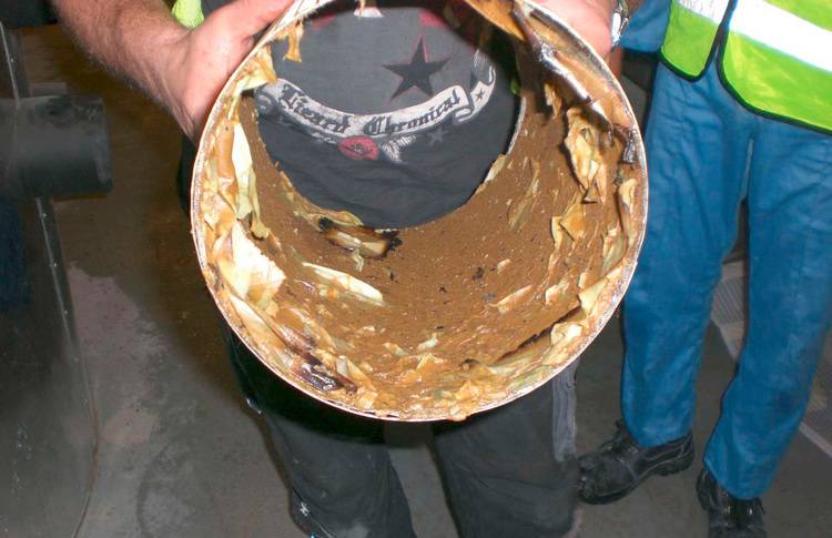 Schon zum dritten Mal in Folge befreien wir die Siebfilter von einer Mischung aus grobem Schmutz, Metallspänen, Abfall und schlimmeren Dingen. Der Geruch bestätigt eine Vermutung: Während der Installationsphase nutzten Unbekannte das noch unfertige Rohrsystem als Alternative zu weit entfernten Müllbehältern und Toiletten. So ein 136 mm Edelstahl-Rohrende ragt dann scheinbar doch zu verlockend aus dem Boden. Wir fotografieren den Fang des Tages und spülen die Siebe mit Wasser aus. Pumpen an, fertig.