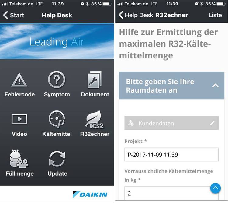 Bei der Planung ist die Auslegung der Kältemittelfüllmenge entsprechend der Raumgröße wichtig. Mit der App DAIKIN to go unterstützt Daikin diese Auslegung. Der Installateur muss lediglich die Daten für die voraussichtliche Kältemittelmenge, die Raumhöhe und -fläche sowie die Einbausituation des Innengeräts eingeben und erhält dann die jeweils zulässige maximale Kältemittelfüllmenge für das zu installierende Gerät.
