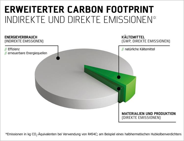 Auch die Umwelt profitiert von energieeffizienten Anlagen. Bild 1 zeigt die Anteile direkter und indirekter Emissionen am exemplarisch berechneten Carbon Footprint eines halbhermetischen Hubkolbenverdichters bei einer Betriebsdauer von 15 Jahren mit dem Kältemittel R454C. Die Abbildung verdeutlicht, dass indirekte Emissionen durch den Energieverbrauch einen besonders hohen Anteil ausmachen. Da der Verdichter in der Regel der Hauptverbraucher in der Kälteanlage ist, lässt sich dieses Berechnungsergebnis auch auf die Gesamtanlage übertragen. Eine hohe Energieeffizienz der Anlage ist daher der entscheidende Hebel, deren Carbon Footprint zu reduzieren.