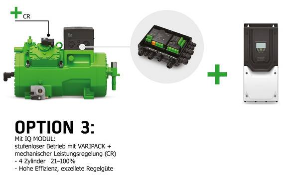 Mit den Lösungen wie der mechanischen Leistungsregelung Varistep, dem externen Frequenzumrichter Varipack und dem IQ Modul CM-RC-02 bietet Bitzer ein optimal abgestimmtes Energiesparpaket für Neu- und Bestandsanlagen und unterstützt seine Kunden und Partner, besonders energieeffiziente Systeme zu realisieren.