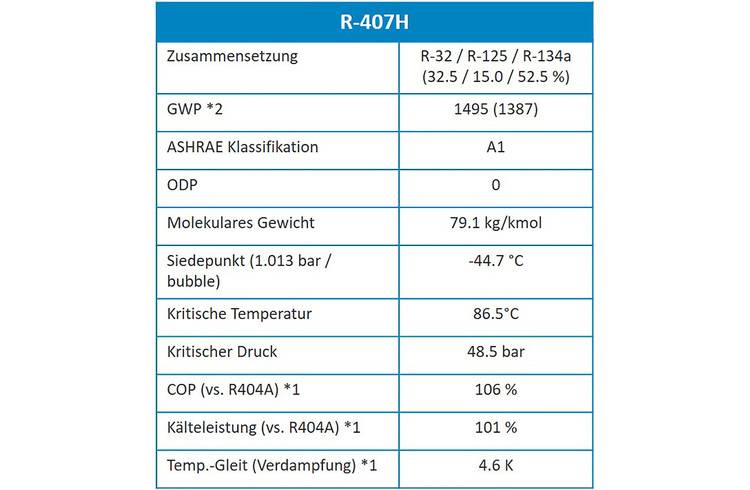 Die Suche nach Alternativen ist in vollem Gange. Eine Alternative ist R407H. Das Kältemittel weist einen um 62% niedrigeren GWP (= 1495) im Vergleich zu R404A auf und kann aufgrund seiner thermo-physikalischen Eigenschaften zur Umrüstung bestehender Anlagen eingesetzt werden.