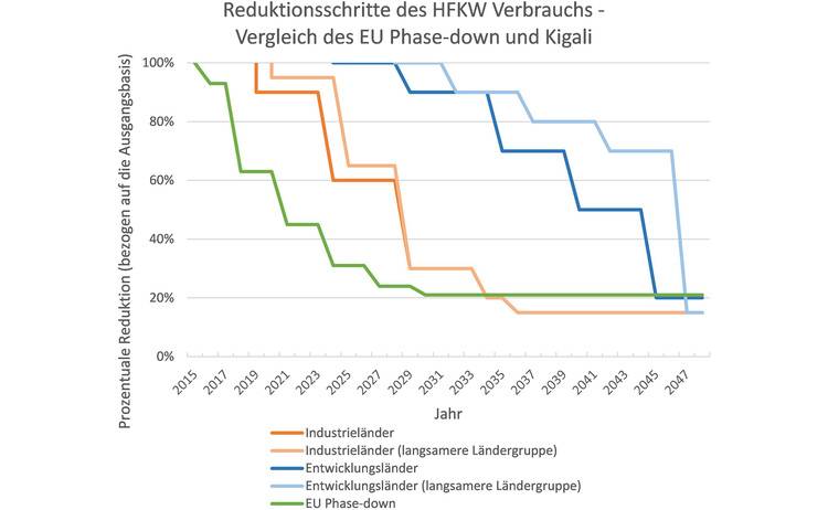 In der Europäischen Union ist die Verbrauchssenkung gemäß der F-Gase-Verordnung (EU) 517/2014 bereits im Jahre 2015 in Kraft getreten und weiter fortgeschritten als im internationalen Vergleich. Der frühere Beginn ist für deutsche und EU-Unternehmen keineswegs ein Nachteil: Aus dem zeitlichen Vorsprung ergeben sich für innovative Kältetechnik besondere Chancen für künftige Marktanteile.