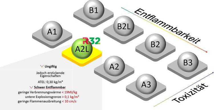 Neben einem geringeren GWP weist R 32 eine rund 20 Prozent höhere volumetrische Kälteleistung gegenüber R 410A sowie eine höhere Effizienz auf.