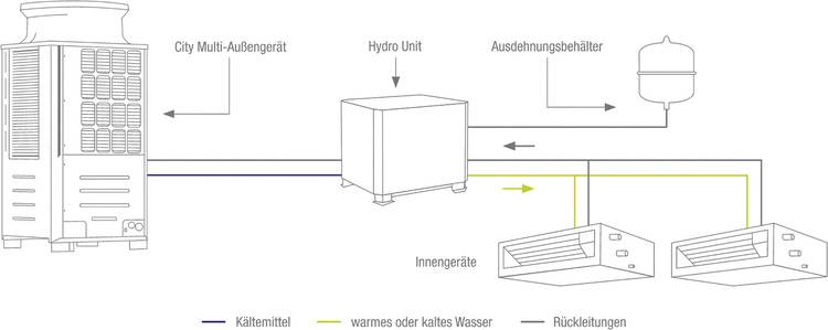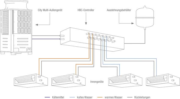 Von hier erfolgt eine Verteilung der Energie in Form von Wärme und/oder Kälte über das Medium Wasser. Der HBC-Controller bzw. die Hydro Unit bildet mit den Außengeräten eine kälte- und regelungstechnische Einheit und leitet je nach Wärme- oder Kältebedarf warmes oder kaltes Wasser zu den Innengeräten der zu klimatisierenden Hotelzimmern weiter.