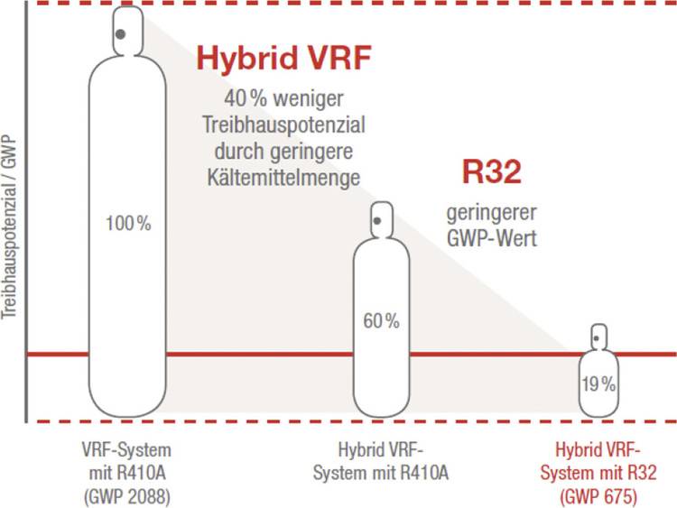 Es gilt also, die Vorteile von VRF-Systemen mit dem Einsatz klimafreundlicher Kältemittel und reduzierter Kältemittelfüllmengen zu verbinden.
