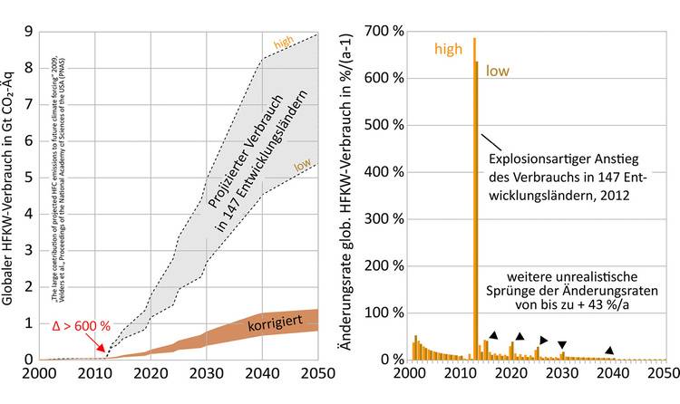 - Auf der Grundlage dieses Irrtums wurde ein globaler Anstieg zukünftiger HFKW-Emissionen um 5000 Prozent auf über 8 Gt t CO₂-Äq für das Jahr 2050 projiziert. Würde der globale Pro-Kopf-Verbrauch von HFKW konstant bleiben, müsste die Weltbevölkerung bis 2050 auf bis zu 140 Mrd. Menschen ansteigen .… oder der globale Pro-Kopf-Verbrauch müsste um bis zu 1500 Prozent ansteigen.