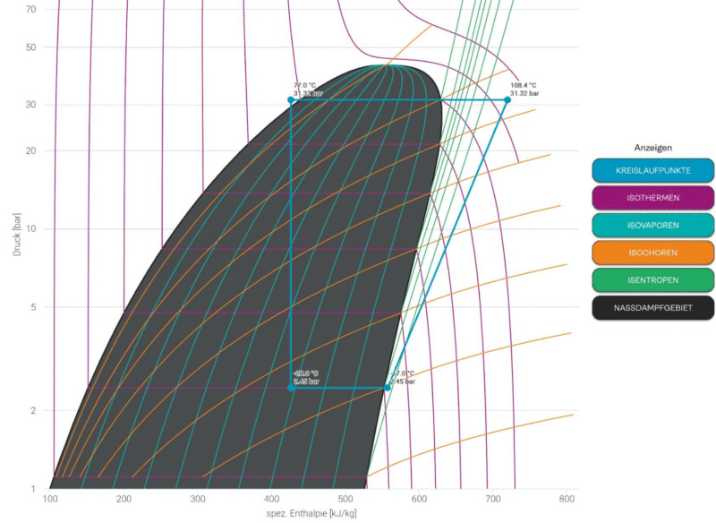 Tipp: Wer sich selber mit dem log-p-h Diagramm verschiedener Kältemittel beschäftigen möchte, findet bei TLK Energy ein sehr gutes und kostenfreies Programm.