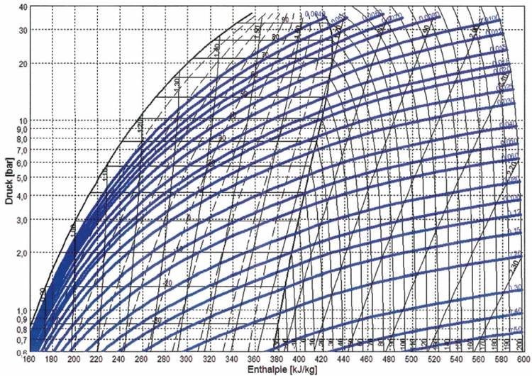 Um in der Kältetechnik Kompressionskälteprozesse darstellen und berechnen zu können, wird das log-p-h-Diagramm, auch Dampftafel genannt, angewendet. Jedes Diagramm ist nur für das jeweilige Kältemittel gültig und enthält dessen spezifische Stoffeigenschaften. Nachfolgend wird das Diagramm schrittweise erklärt, sodass am Ende des Kapitels die entsprechenden Betriebszustände aus dem Diagramm abgelesen werden können.