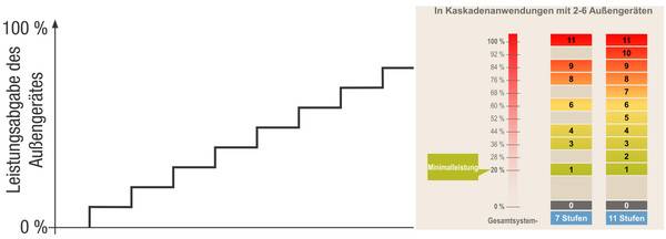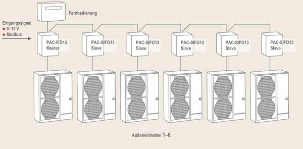 Die besondere Intelligenz der Schnittstelle liegt dann in der Regelung der Einsatzzeiten und -bedingungen einer Kaskade. Mitsubishi Electric löst diese Thematik beispielsweise über sein Anschlusskit PAC-IF013 auf, mit dem sich eine Kaskadenregelung für bis zu sechs Außengeräte der Mr.-Slim-Serie umsetzen lässt. Dadurch kann eine Gesamtleistung bis zu 168 kW Kälte- und 189 kW Heizleistung erreicht werden, die bedingt durch die Kaskade über eine äußerst attraktive Modulations-Bandbreite verfügen kann. Reichen diese Leistungen nicht aus, kann auf die VRF-Technologie gesetzt werden, die vergleichbare Funktionalitäten anbietet.