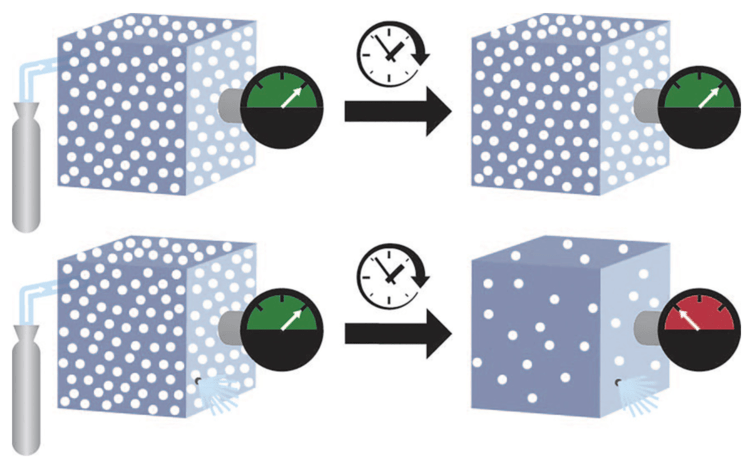 Bei der Druckanstiegsmethode wird also zunächst das Prüfteil evakuiert. Steigt der Druck im System dann innerhalb der definierten Messzeit an, so ist dies auf vorhandene Leckagen zurückzuführen. Aufgrund des Vakuums sind Temperaturschwankungen für diese Prüfmethode weniger relevant.