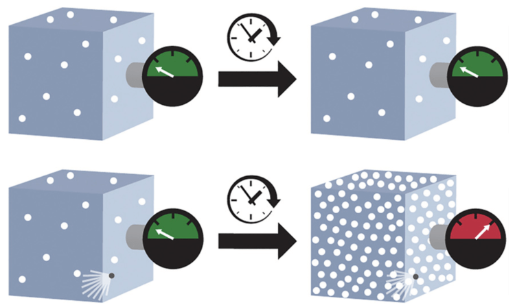 Eine Temperaturänderung während der Messung führt überdies zu einem verfälschten Messergebnis, da zwischen beiden Parametern ein proportionaler Zusammenhang besteht. Hierzu muss man das Prinzip der Druckabfallprüfung betrachten: Der Prüfling ist bis zu einem definierten Überdruck mit Prüfgas gefüllt, das durch vorhandene Lecks entweicht, wodurch der Druck sinkt. Wenn sich jedoch während dieser Messung der Druck infolge eines Temperaturanstiegs erhöht, werden eventuelle Leckagen einfach übersehen.