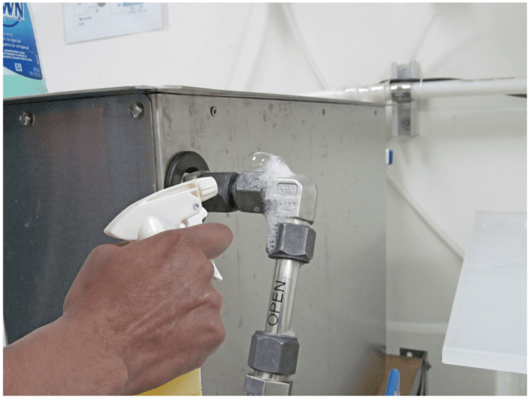 Um Leckagen zu lokalisieren, kommt häufig Lecksuchspray zum Einsatz. Dafür sprüht der Prüfer potenzielle Leckstellen mit einem Netzmittel ein. Im Falle eines Lecks tritt Luft aus, und es bilden sich sichtbare „Seifen-Bläschen“.