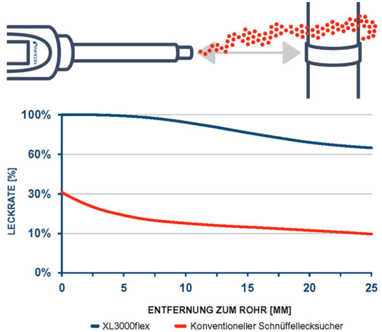 Das Schnüffellecksuchgerät XL 3000flex beispielsweise ist speziell auf die Anforderungen der Kälte- und Klimaindustrie abgestimmt und erreicht eine hohe Prozesssicherheit. Dafür gibt es insbesondere drei Gründe: