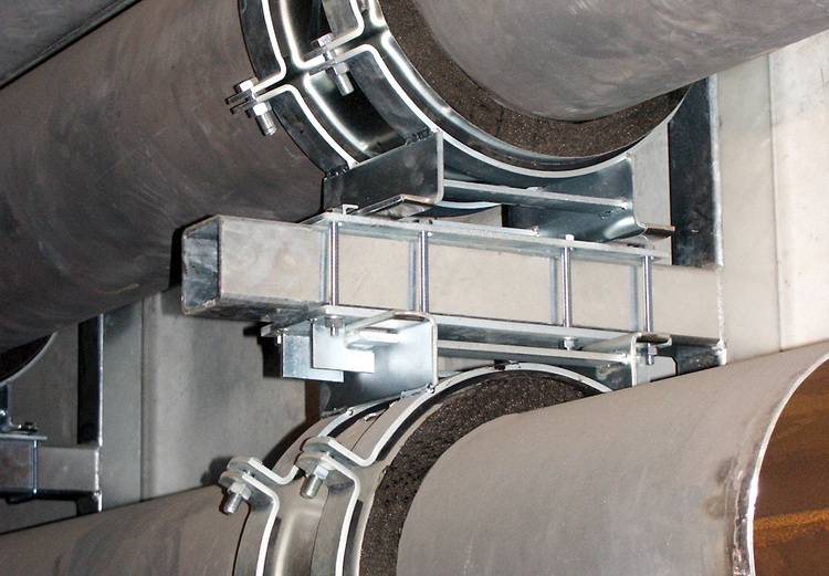 Die Rohrhalterung muss die anfallenden Lasten sicher aufnehmen und zugleich Wärmebrücken so gut wie möglich ausschließen – kommt es im Bereich der Halterung im Vergleich zum ungestörten Dämmsystem zu einer örtlich begrenzten höheren Wärmestromdichte, besteht die Gefahr der Tauwasser- oder sogar Eisbildung. Die beiden Anforderungen stellen einen gewissen Widerspruch dar: Einerseits ist ein Rohrträger umso tragfähiger, je höher die Dichte des verwendeten Dämmstoffes ist. Andererseits hat der Dämmstoff umso bessere Dämmeigenschaften, je niedriger seine Dichte ist. Hochwertige Spezialrohrschellen für kaltgehende Leitungen zeichnen sich daher durch eine optimale Kombination aus guten Dämmeigenschaften und hoher Tragekraft aus und erlauben es so, die von der Rohrherstellern vorgegebenen maximalen Befestigungsabstände bis zur Grenze auszureizen.