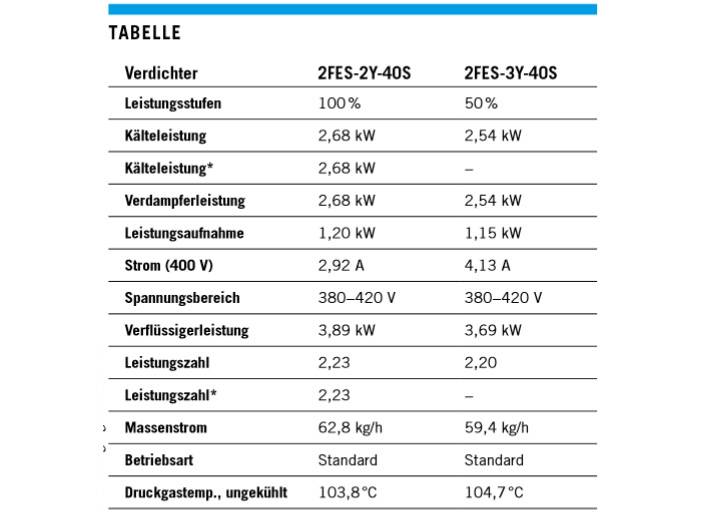 Um die Kosten und Abmessungen klein zu halten, sollen nur zwei Verdichter verwendet werden. Verdichter 1 ist kleiner und FU-geregelt. Verdichter 2 ist mit einem Leistungsventil ausgestattet und leistet 50 oder 100 Prozent. Bei Störung des Frequenzumrichters kann Verdichter 2 im Notbetrieb weiter laufen.