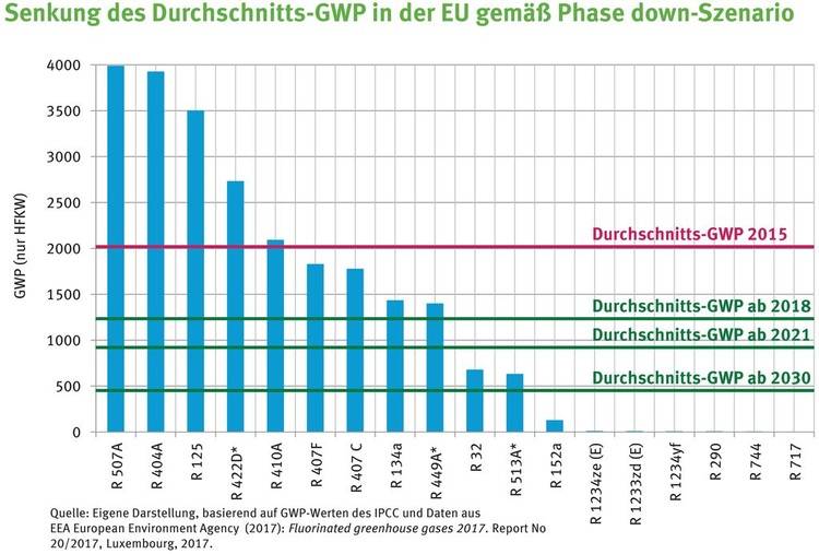 3. ‚Durch die Senkung des Durchschnitts-GWP in der EU gemäß dem F-Gase-Phase-down-Szenario […] wird dem Markt ab 2018 ein Großteil der teilfluorierten Kältemittel ‚entzogen‘, ab 2021 auch das Kältemittel R134a und das als Ersatzkältemittel für R410A gehandelte R-32. Dann stehen für neue kältetechnische Anlagen und Geräte fast nur noch halogenfreie Kältemittel zur Verfügung, wie Propan, Kohlendioxid, Ammoniak oder Ammoniak-Dimethylether-Gemische.‘
