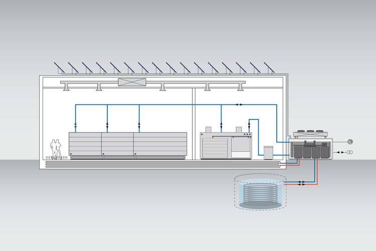 Eine weitere Besonderheit des innovativen Energiesystems von Viessmann ist der Eis-Energiespeicher, der die Phasenwechselenergie von Wasser zu Eis nutzt. An besonders kalten Tagen kann aus dem thermischen Speicher sehr effizient zusätzliche Wärme entzogen werden. Im Sommerbetrieb können am Tag über die Photovoltaik-Anlage die Wärmepumpen auch zum Eisaufbau im Eis-Energiespeicher genutzt werden, um die gespeicherte regenerative Sonnenenergie in der Nacht zur Kühlung der Kühlstellen zu verwenden. Viessmann nennt diese Funktion Power2Ice.