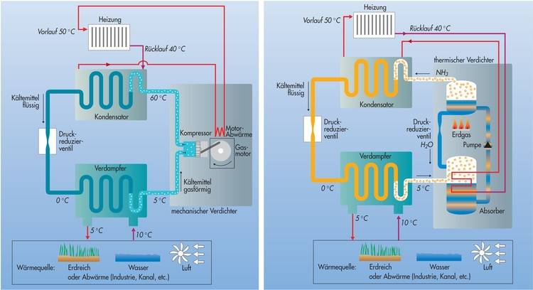 Neben dem Nutzen, Kälte zu produzieren, hat dieser Prozess noch eine weitere verblüffende Möglichkeit zur Steigerung der Energieeffizienz bei der Beheizung von Gebäuden parat. Wenn der Nutzen einer herkömmlichen Heizungsanlage gesteigert werden soll, kann durchaus der skizzierte Prozess der Absorptionskältemaschine integriert werden. Anstatt Kälte zu liefern, kann mit diesem Prozess Wärme aus der Umwelt entzogen werden.