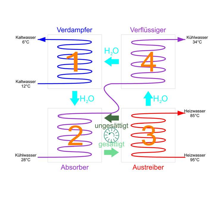 - Nach diesem Prozess-Schritt ist Lithiumbromid wieder aufnahmebereit für das soeben ausgetriebene Wasser und wird zurückgepumpt in den Absorber (2).