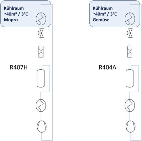 Die Kühlräume sind nebeneinander unter einem gemeinsamen 10 m hohen Dach aufgestellt. Sie laufen beide unter vergleichbaren Umgebungsbedingungen. Die Verflüssigersätze, bestehend aus Kompressor, Verflüssiger und Flüssigkeitssammler, sind direkt auf der Decke des jeweiligen Kühlraums installiert. Es wurden keine speziellen Maßnahmen unternommen, um das ursprüngliche R404A-System auf R407H umzustellen. Lediglich Anpassungen am Expansionsventil wurden vorgenommen. Das R407H-System wurde mit 90 Prozent der R404A-Nennfüllmenge gefüllt.