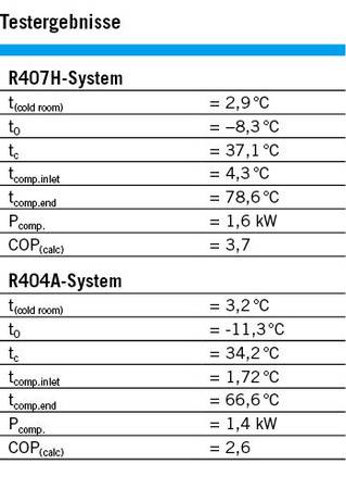 Selbst unter Berücksichtigung der etwas niedrigeren Kühlraumtemperatur konnte die Verdampfungstemperatur der R407H-Anlage um 3 K angehoben werden, verglichen mit der R404A-Anlage. Die berechnete Leistungszahl (COP) und die gemessene Verdichterendtemperatur profitieren von der Maßnahme der angehobenen Verdampfungstemperatur. Obwohl die Leistungsaufnahme des Kompressors der R407H-Anlage von 1,6 kW etwas höher war gegenüber der Leistungsaufnahme von 1,4 kW der R404A- Anlage, konnte aus Enthalpiedifferenz und Massenstrom eine höhere Kälteleistung mit der R407H-Anlage erreicht werden. Die Leistungszahl der R407H-Anlage war mit 3,7 signifikant höher gegenüber der Leistungszahl von 2,6 der R404A-Anlage.