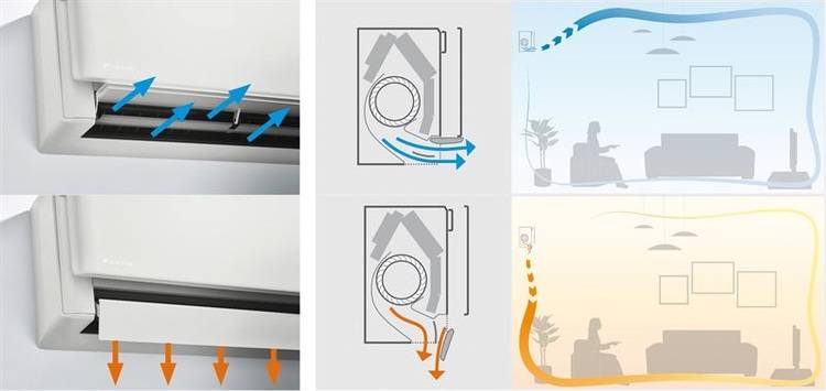 Der neue Lüfter von Stylish wurde speziell für das kompakte Wandgerät entwickelt. Er ermöglicht einen optimierten Luftstrom für mehr Energieeffizienz und einen geräuscharmen Betrieb. Spezielle Lamellen gewährleisten einen fokussierten Luftstrom für eine bestmögliche Temperaturverteilung. Hier kommt der sogenannte Coandă-Effekt* zum Tragen: Stylish variiert das Luftstromprofil abhängig davon, ob der Raum geheizt oder gekühlt wird. Im Heizmodus lenkt das Gerät die Luft mit zwei Lamellen nach unten (vertikaler Luftstrom), im Kühlmodus nach oben (Deckenluftstrom). Diese beiden Luftstromprofile vermeiden Zugluft und sorgen für stabile und komfortable Raumtemperaturen.