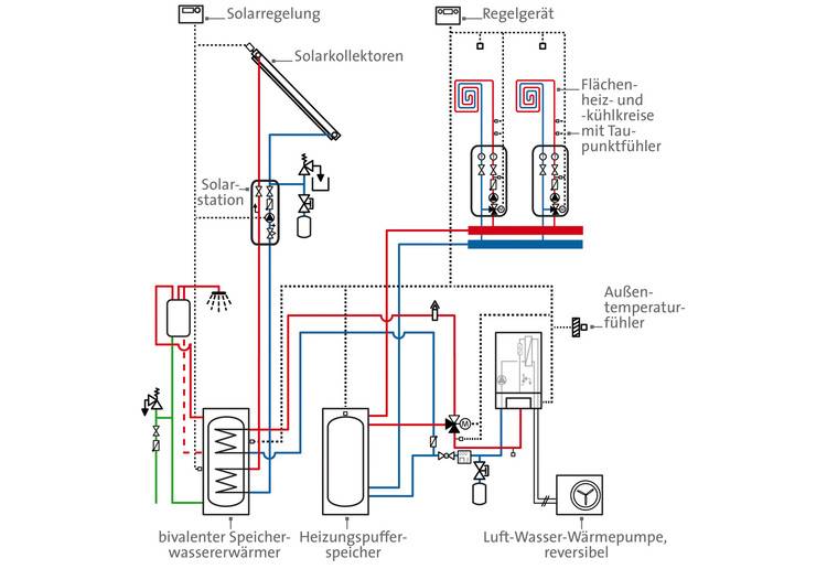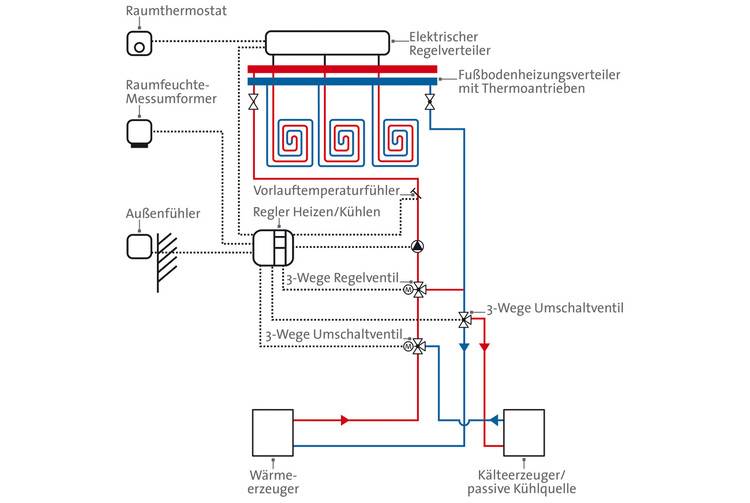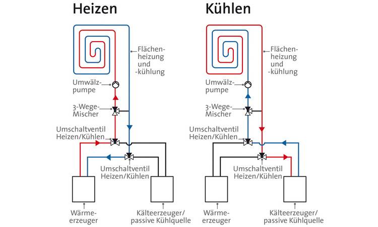 Um mit einer Flächenheizung/-kühlung vom Heizbetrieb in den Kühlbetrieb wechseln zu können, ist eine Umschaltung von einer Wärmequelle auf eine Wärmesenke notwendig. Der Heizkreisverteiler versorgt die Wärmeübergabekreise mit einer Vorlauftemperatur, die deutlich niedriger als die Raumtemperatur ist und wird dadurch zum Kühlkreisverteiler.