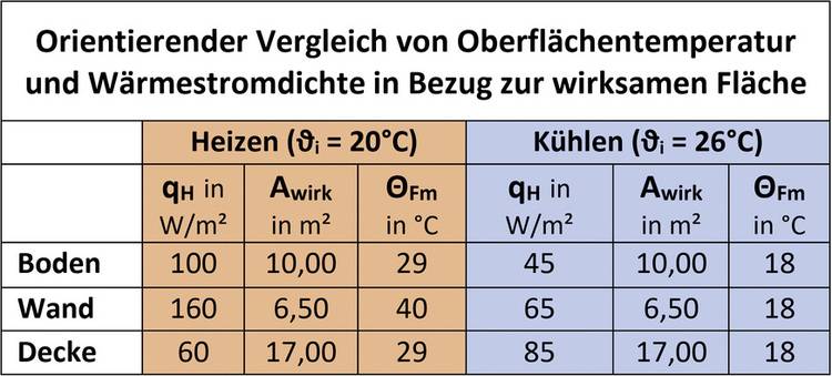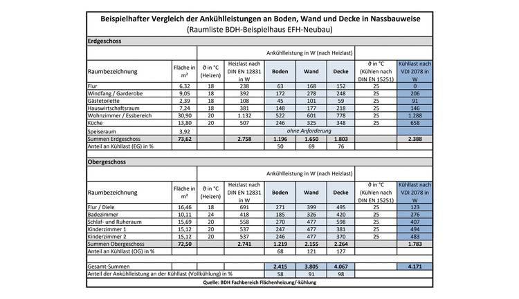 Die Tabelle (oben) zeigt einen Vergleich der Ankühlleistungen an Boden, Wand und Decke, die aus der Auslegung nach Heizlast resultieren, im Bezug zu der berechneten Kühllast nach VDI 2078, welche den Anforderungen der Vollkühlung entspricht. Des Weiteren sind in diesem Vergleich auch die systembedingten Unterschiede in den Anwendungen Boden, Wand und Decke klar zu erkennen. Darüber hinaus zeigt die Tabelle auch einen prozentualen Anteil an der Kühllast, die eine Ankühlung zu erreichen vermag.