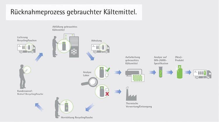 Die Westfalen AG befasst sich schon seit Mitte der 90er-Jahre mit der Verwertung gebrauchter Kältemittel, sei es zur Aufarbeitung bis zur Qualität der Neuware oder der Aufspaltung zu Salz- und Flusssäure, also in Grundstoffe für die chemische Industrie. Die Möglichkeit der Aufarbeitung setzt allerdings voraus, dass die Kältemittel sortenrein zurückgegeben werden. Sind zum Beispiel dem Kältemittel R404A andere Produkte wie R410A oder gar R22 beigemischt, ist eine Aufarbeitung nicht mehr möglich. Hier wäre ein teures Destillierverfahren notwendig.