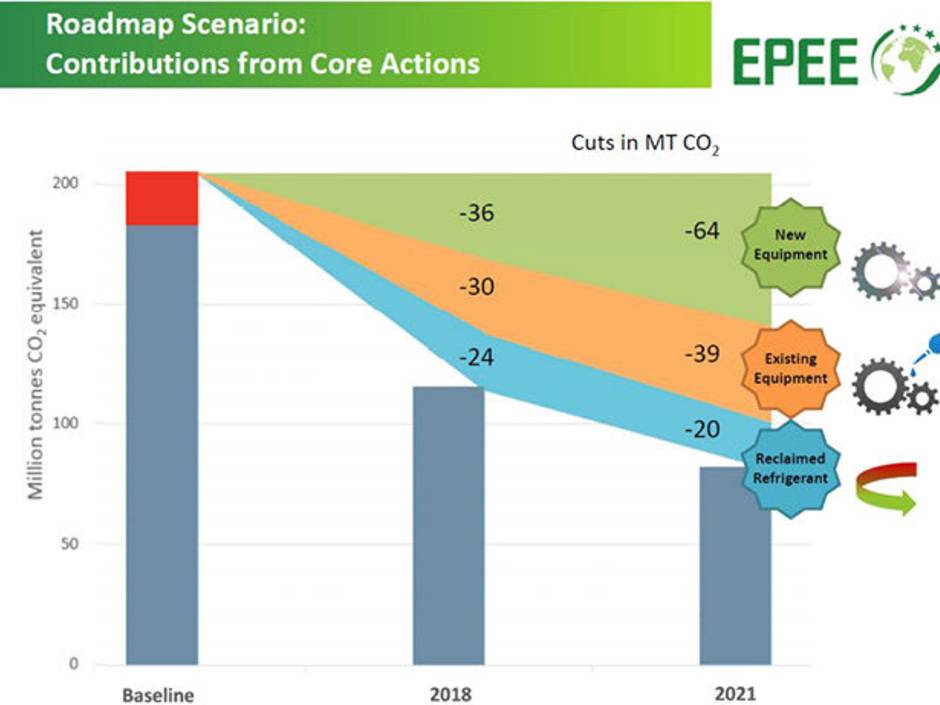 - Einsparung von 36 Mio. Tonnen CO2-Äquivalenten durch neue Systeme mit Kältemitteln mit niedrigerem GWP oder mit Kältemitteln, die nicht reportpflichtig sind.