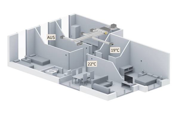 Im Rahmen der Klimatisierung erfolgt die Aufteilung der Räumlichkeiten in bis zu acht einzelne Zonen, deren Temperatur unabhängig voneinander geregelt wird. Die äußerst flexible Steuerung dieser Zonen ermöglicht eine Anpassung der Solltemperatur in 0,5 °C-Schritten, die Temperaturabweichung liegt bei max. 0,3 °C. Die individuelle Steuerung ermöglicht zudem eine bedarfsabhängige Leistungsanpassung des Kanalgerätes: Nur in aktuell belegten Zonen wird tatsächlich Energie verbraucht. Dies hat eine signifikante Reduzierung der Betriebskosten zur Folge.