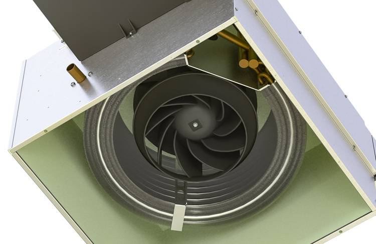 Eine metallene Designblende mit optimiertem Auslass sorgt laut Hersteller für maximale Behaglichkeit durch seitlichen Luftaustritt und damit Ausnutzung des Coanda-Effektes. Die ausströmende Luft verteilt sich entlang der Raumdecke und sinkt mit geringer Geschwindigkeit hinab. Eine klappbare Sichtblende ermöglicht den einfachen Zugang zu Wartungskomponenten.