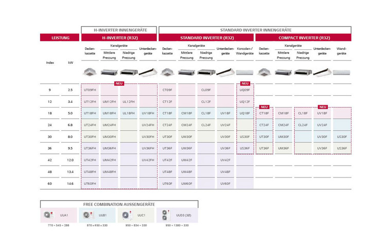 Ein Beispiel: Die Außeneinheiten UUA1 (2,5 kW bis 3,4 kW), UUB1 (5 kW bis 8 kW) und UUC1 (6,8 kW bis 9,5 kW) eignen sich künftig für alle Produktlinien und treffen immer auf eine Inneneinheit, die zu ihrem Leistungsvermögen passt. Eine Ausnahme bildet das dreiphasige Dual Fan-Modell UUD3 (9,5 kW bis 14,6 kW), welches nur mit H-Invertern und Standard-Invertern kompatibel ist.