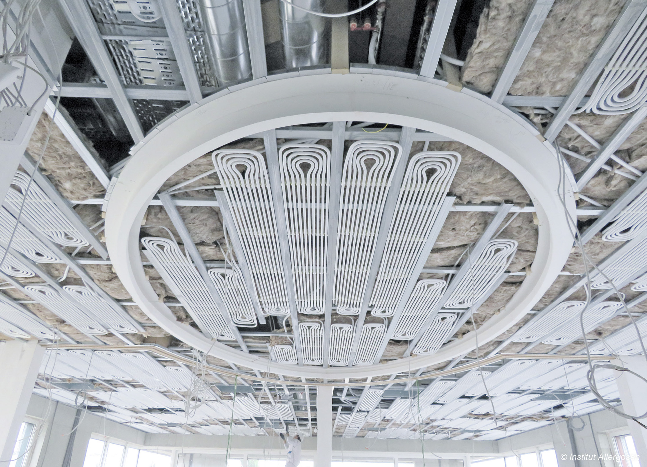 Die einzelnen Elemente bestehen aus vorgefertigten Mäandern aus Alu-Verbundrohr, die mit Befestigungsschienen fixiert sind. An diesen befinden sich Federbügel, die eine schnelle und werkzeugfreie Montage an den CD-Profilen der Deckenunterkonstruktion ermöglichen, ohne dass ein Verschieben der bauseitigen Unterkonstruktion notwendig wird (Bild 4). Der Installateur hängt die Elemente einfach zwischen die CD-Profile. Anschließend verkleidet der Trockenbauer die Decke genauso wie Decken, die ohne Kühlung konstruiert sind.
